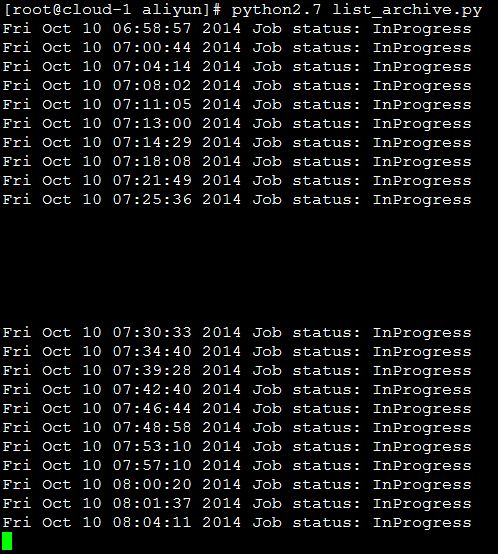1 起步 1.1 初识OAS 啥是OAS,请看官方说明: 引用 开放归档服务(Open Archive Service,简称OAS),致力于提供低成本、高可靠的数据归档服务,适合于大数据的长久归档备份。 低成本、高可靠,长久归档备份,这是它的特色。 1.2 申请开通 当前还处于公测阶段,需要申请,试用期间,免费试用,每个用户可以存储不超过10T的数据,并且文件数量不超过10万个,大伙有什么* * * * * * *,没地方放的,可以考虑考虑喔,不过对于文件唤起要一段时间,哪怕是刚上传还是1KB的文件。 1.3 接口与SDK 引用 提供完整API,所有功能都可以通过API接口完成,便于用户的程序化实现。同时提供了多语言SDK。 官方说有提供多语言SDK,但我只看到Python版本的可供下载,难道忘记上传了,哈哈,大伙赶紧帮忙封装些: Python 手册与SDK下载: 复制代码 1.http://imgs-storage.cdn.aliyuncs.com/help/oas/OAS_Python_SDK_帮助手册_140910.pdf 2.http://imgs-storage.cdn.aliyuncs.com/help/oas/OAS_Python_SDK_0.1.7.zip 安装方法: 复制代码 1.pip install oassdk 或 pip install --upgrade oassdk API文档下载: 复制代码 1.http://imgs-storage.cdn.aliyuncs.com/help/oas/OAS-API-Reference-Full-v0.1.24.pdf 不过提供的restful api文档看起来比较舒服,个人感觉比OSS的api手册好,可能是比较晚出来,编辑的比较好吧~~(●’◡’●)。 2 实践 2.1 准备知识 下载SDK后,可以根据《OAS_Python_SDK_帮助手册_140910.pdf》进行操作,或者能力比较强爱折腾的,也可以根据reset api通过其他语言的开发。 引用 在使用 Python SDK 或阅读本手册之前,请务必先阅读《OAS API 参考手册》 来自帮助手册的第一句话,看到这,马上想到:欲练此功,必先自宫。使用前还是先去恶补下必备知识,对 Vault、Archive、Mupltipart Upload、Job 等基础概念的了解。 简单归纳如下: 引用 Vault 是 OAS 提供给用户用于管理 Archive 的目录,也是计费、权限控制等功能的管理单位,它在每个用户的每个区域(杭州、青岛、北京、香港)下唯一,每个用户在每个区域 最多可以自建 10 个,每个 Vault 里可以包含任意数量的 Archive。 用户操作的基本数据单元是 Archive,它需要包含在 Vault中,它可以是任意类型的数据,上传 Archive时,文档大小限制在 6GB,如果大小超出 6GB,请使用 分块上传方式,使用分块上传最大可以上传 1000*10GB 的文档,不仅如此,多段上传还支持独立、任意顺序、甚至并行上传这些段,如果某段上传失败,只需要重新上传该段即可。 SDK包含低级接口与高级接口: 引用 低级接口是 OAS RESTful 接口的直接映射,每一个 RESTful 接口均对应于低级 接口的一个方法。 高级接口在低级接口的基础上,进一步封装了校验码生成、自 动重试、断点续传等高级功能。用户在使用过程中不需要关心高级接口内部实际 调用的是哪个 RESTful 接口,只需按照所需的业务类型调用接口即可,如上传、 查询等。 低级接口更底层,高级更友好,要不是闲的没事干就不要用低级接口了~~ 2.2 运行环境 引用 OAS Python SDK 要求的运行环境是 Python 2.7(含)以上,3.0 以下。 对于Python版本要2.7以上,3.0以下!!注意!!,2.6的不可使用,意味着Centos6以及以下版本,通过Yum安装的,都不能直接使用喔,LZ中招,需自行安装Python2.7。 版本查看方法: 复制代码 1.python --version Python与OAS SDK安装: 复制代码 1.mkdir /tmp/aliyun 2.cd /tmp/aliyun 3.wget https://www.python.org/ftp/python/2.7.8/Python-2.7.8.tgz 4.tar xzvf Python-2.7.8.tgzcd Python-2.7.8 5../configure 6.make && make install 7.# 至此,python 2.7 安装完成,可通过命令( python2.7 --version )来验证 8. 9. 10.# 安装OAS SDK 11.cd /tmp/aliyun 12.wget http://imgs-storage.cdn.aliyuncs.com/help/oas/OAS_Python_SDK_0.1.7.zip 13.unzip OAS_Python_SDK_0.1.7.zip 14. 15. 16.# 依赖包,就simplejson与pyaml两个 17.pip install -r requirements.txt 18. 19. 20.# 或,自行下载安装依赖组建 21.#wget https://pypi.python.org/packages/source/s/simplejson/simplejson-3.6.4.tar.gz 22.#wget http://pyyaml.org/download/pyyaml/PyYAML-3.11.tar.gz 23. 24.python2.7 setup.py install 请进行安装验证,如图,无报错则继续大功告成。 2.3 简单示例 2.3.1 获取OAS连接 复制代码 1.from oas.oas_api import OASAPI 2.from oas.ease.vault import Vault 3. 4. 5.accessKeyId = "xxxxxxxxxxxxxxxx" 6.accessKeySecret = "ooooooooooooooooooo" 7.serverHost = "cn-hangzhou.oas-internal.aliyuncs.com" 8. 9. 10.# 创建 OASAPI 对象 11.api = OASAPI(serverHost, accessKeyId, accessKeySecret) 通过这里获取accessKeyId与accessKeySecret: 复制代码 1.https://i.aliyun.com/access_key/ 通信服务地址,serverHost的由来: 引用 2.1.1 服务地址 OAS API 的服务接入地址为: 公网:RegionName.oas.aliyuncs.com 内网:RegionName.oas-internal.aliyuncs.com 其中,RegionName 为: cn-hangzhou、cn-qingdao、cn-beijing、cn-hongkong 等。现 阶段只开放 cn-hangzhou。 哥,自豪的使用ECS,当然就走内外地址了,既:cn-hangzhou.oas-internal.aliyuncs.com 2.3.2 建立Vault 复制代码 1.... 2.请复制上 #获取OAS连接 代码 3.... 4. 5. 6.# 待创建Vault的名称 7.vaultName="henji_org" 8. 9. 10.# 创建 Vaultvault = Vault.create_vault(api, vaultName)