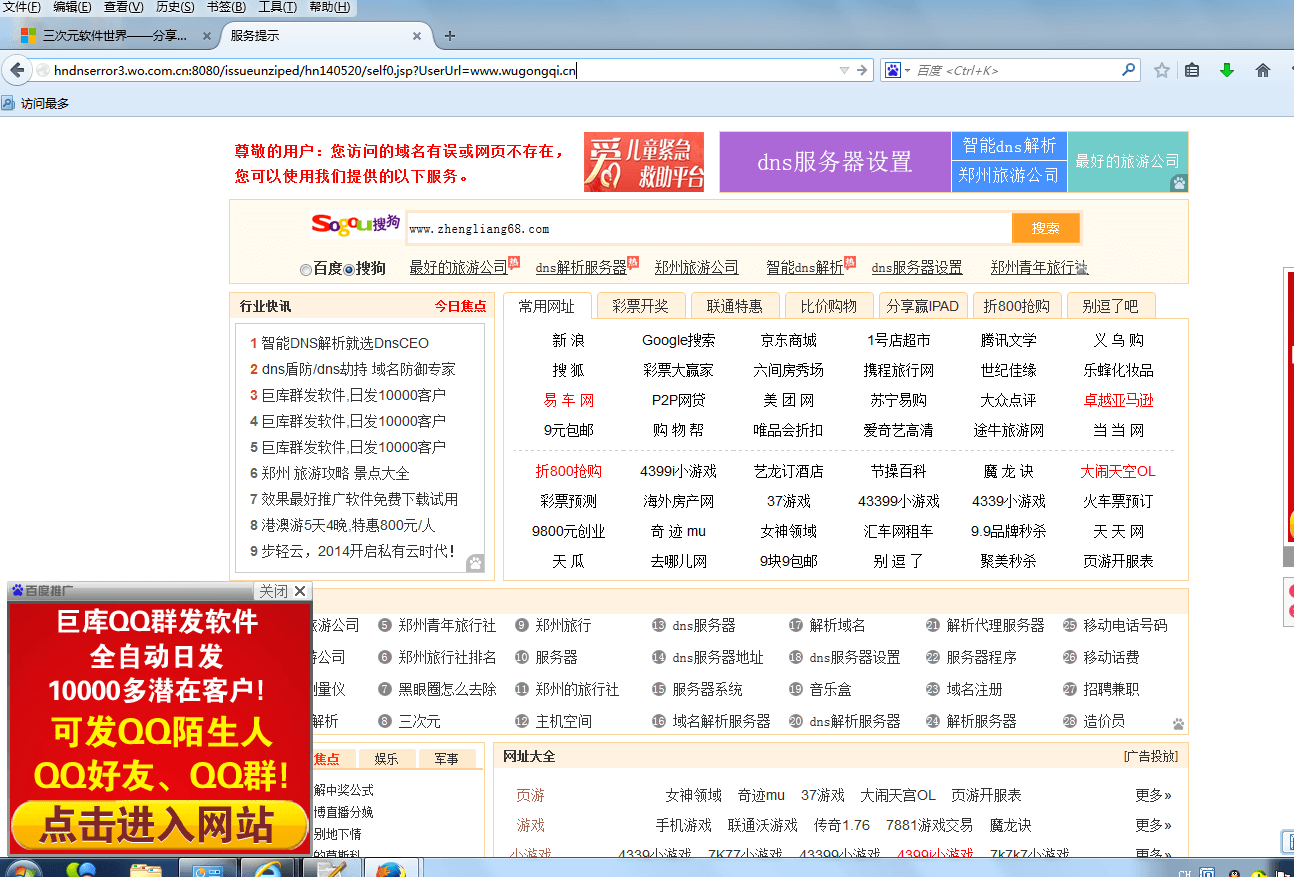 DNS服务器地址在ADSL(PPPoE)等多种联网方式下,会由互联网接入商(ISP)向用户自动提供。但这些接入商提供的DNS服务器,往往为了商业推广的目的,在域名解析错误时插入所谓的“纠错”页面,替代正常的错误信息,用户体验令人作呕: