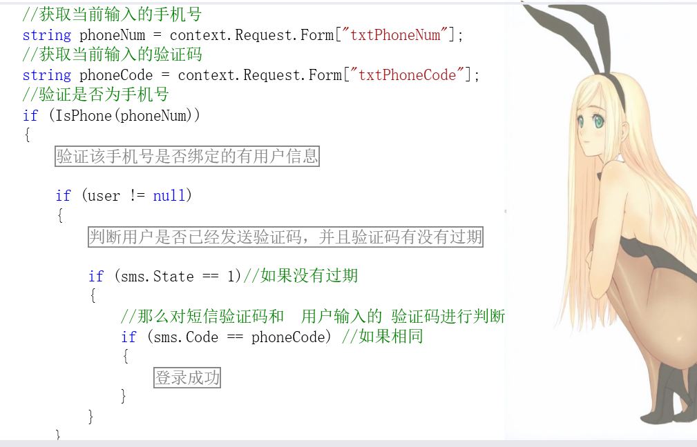 整体流程为,当用户输入手机号发送验证并填写验证码点击登录按钮的时候,我的后台,会接收到用户填写的 手机号 和 验证码 , 如果 验证码与运营商返回给我的验证码相同的话,那么就登录成功。