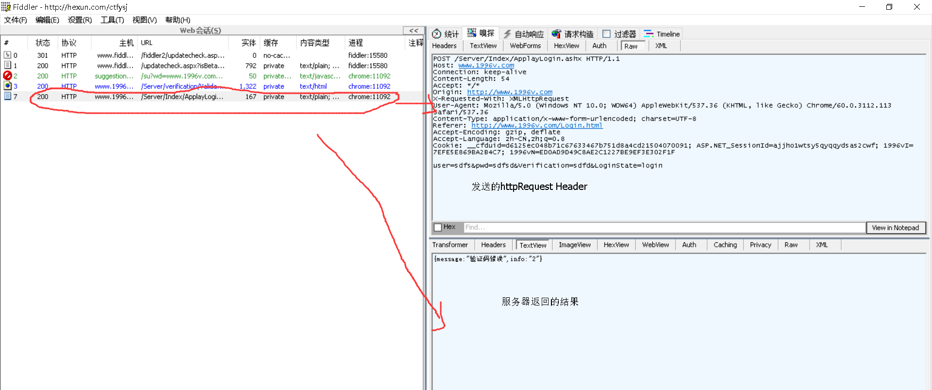 你点击页面登录按钮,然后就会有一个ajax请求发送的http协议,而fiddler则会捕获这个请求,如图,双击对应的请求,右侧上方raw选项卡下则是该请求的httpRequestHeader,就是发送的http协议头了,服务器收到这个协议后会返回HttpResponseHeader输出流,在textview选项卡下可以看到。