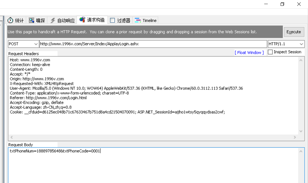 txtPhoneNum=18889785648&txtPhoneCode=0001 这就是发送的参数, 填写在Request Body里面,代表着ajax中 data的部分,最后点击Execute按钮 进行发送。