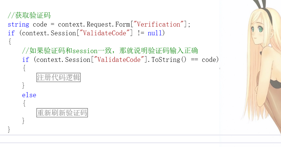 也就是这个接口 http://www.1996v.com/Server/verification/ValidateCode.aspx ,它会在我后台 产生一个 Session [” ValidateCode “] ,当我点击注册的时候,我会效验这个 Session [” ValidateCode “] 是否存在,如果存在就效验与浏览器传给我的 验证码值是否相等,如果相等则进行 接下来的注册代码逻辑。