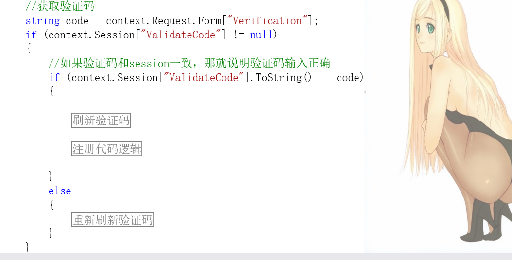 而服务端,则是判断了session不为null,以防止未将对象引用到对象实例,又判断了与浏览器接收过来的code是否相等,不相等则调用验证码刷新接口,那么,还有什么我没有考虑到的呢?