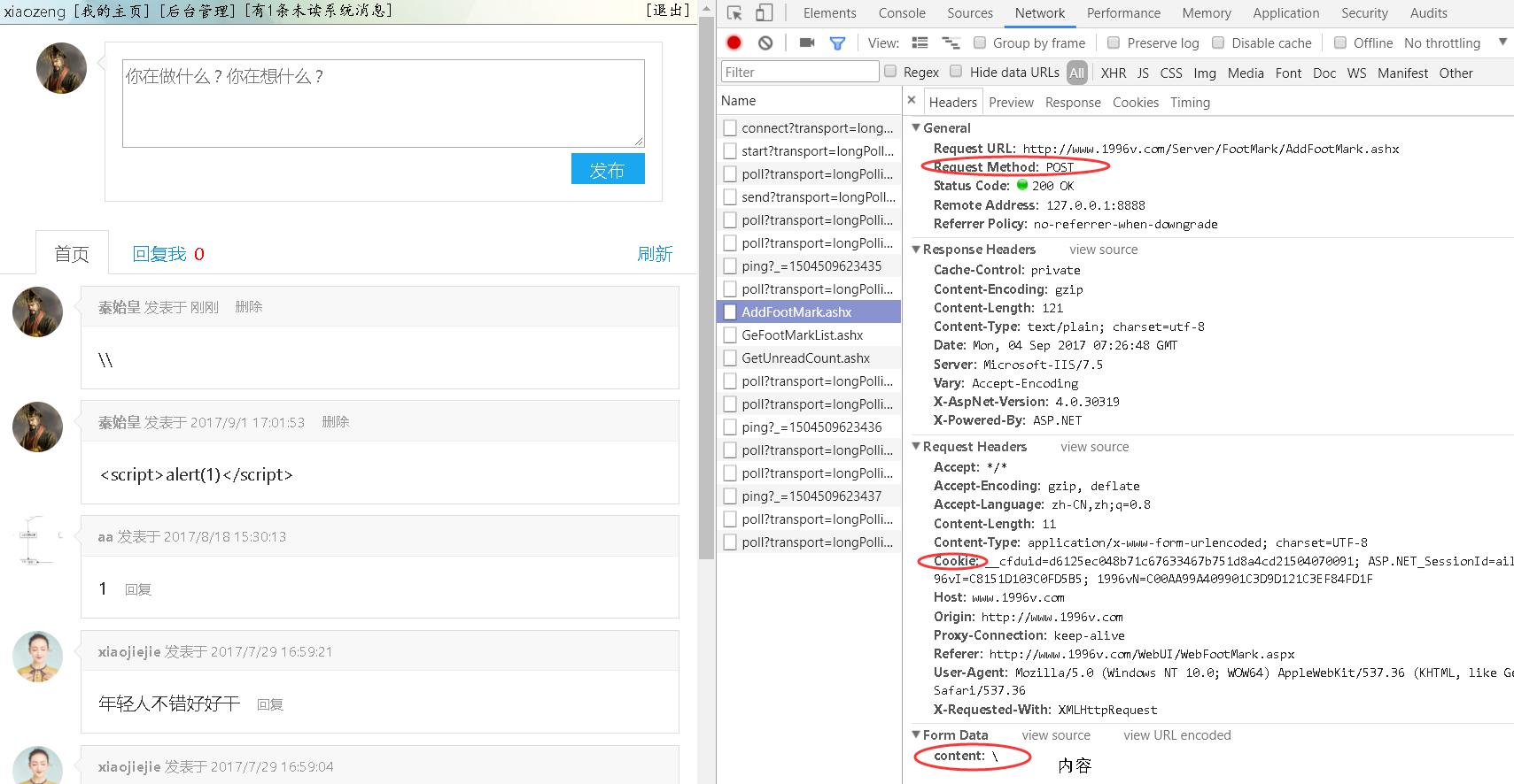 我们会发现,当点击【发布】按钮的时候,实际上是以Post的方式调用了 http://www.1996v.com/Server/FootMark/AddFootMark.ashx 这个接口。