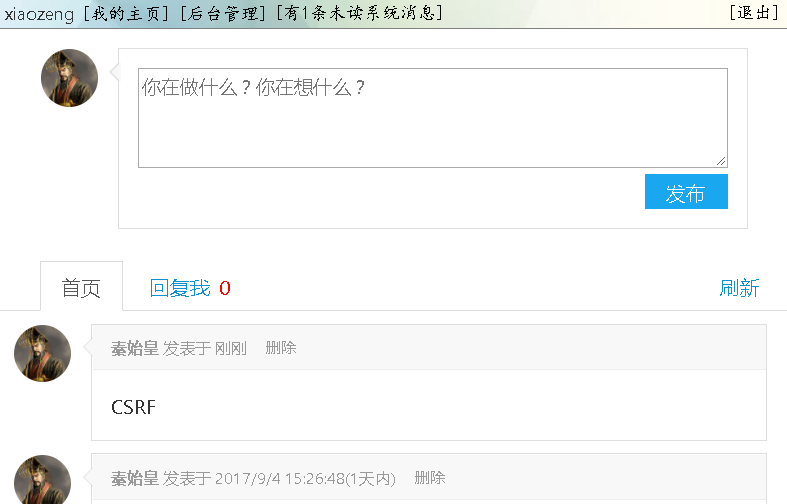 发现 发表成功,我们在转回留言页面,发现同样的是一行CSRF出现在留言板上。