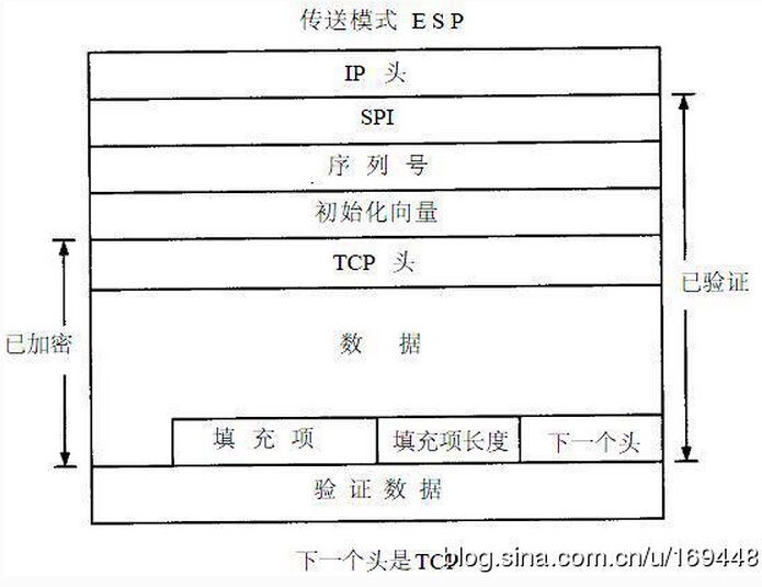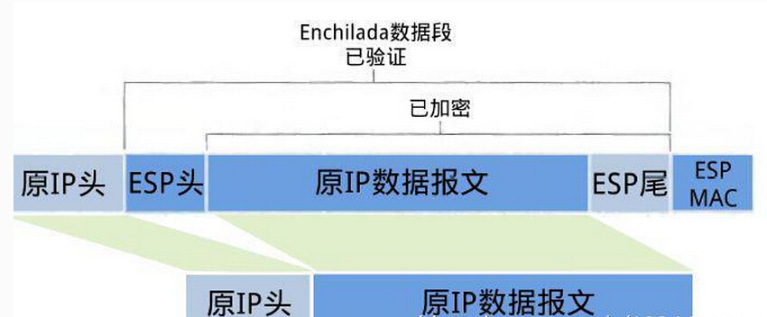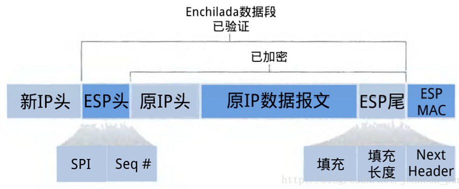 ESP头由两部分组成,SPI和序号(Sequence number)。加密数据与ESP头合称为“enchilada”。