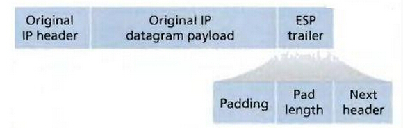 1. 在原IP报文末尾添加尾部(ESP trailer)信息。如上图所示,尾部包含三部分。由所选加密算法可能是块加密,那么当最后一块长度不够时就需要进行填充(padding),附上填充长度(Pad length)方便解包时顺利找出用来填充的那一段数据。而Next header则用来标明被加密的数据报文的类型,例如TCP。