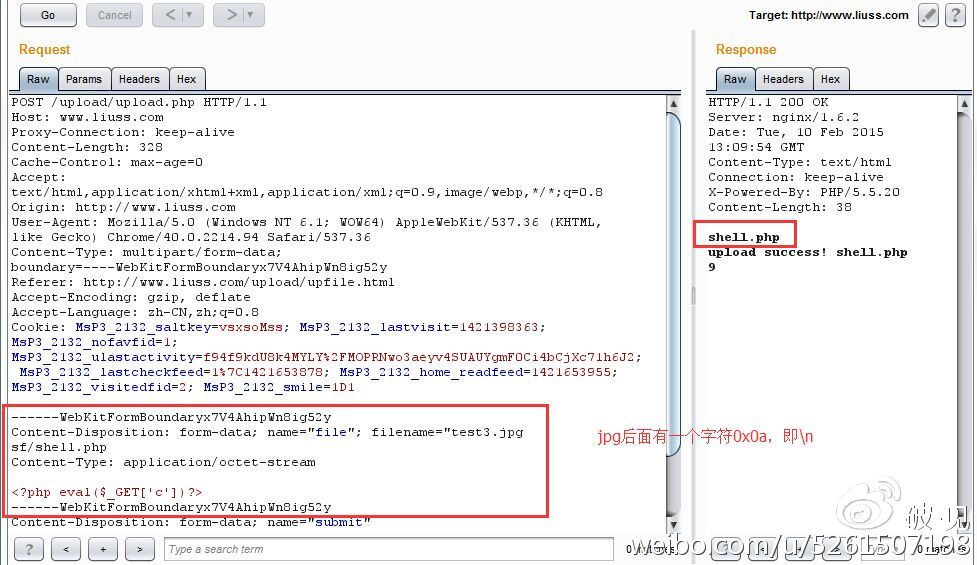 根据原理构造绕过WAF文件上传防御的payload,WAF解析到的文件名为”test3.jpg”,而PHP解析到的文件名是”test3.jpgnf/shell.php”,因为”/”是目录分隔符,上传的文件名变为shell.php。以下是绕过paylaod、测试脚本、paylaod进行文件上传的效果图。