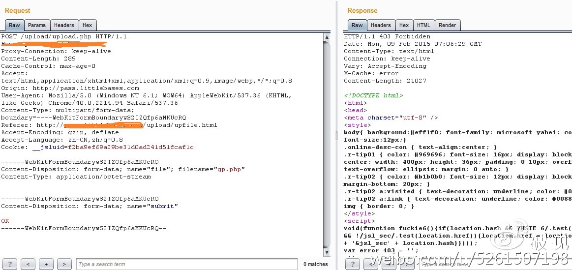 步骤一:验证网站被百度云加速保护,拦截了直接上传PHP文件的请求。