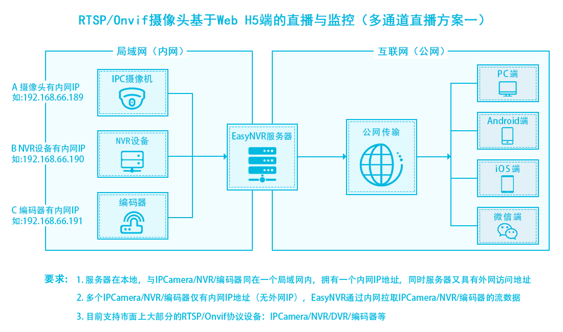 EasyPNVR能够通过简单的网络摄像机通道配置,将传统监控行业里面的高清网络摄像机IP Camera、NVR等具有RTSP协议输出的设备接入到EasyNVR,EasyNVR能够将这些视频源的音视频数据进行拉取,转换为HTTP-FLV/RTMP/HLS,进行全平台终端H5直播(Web、Android、iOS),并且EasyPNVR能够将视频源的直播数据对接到第三方cdn网络,实现互联网级别的直播分发。