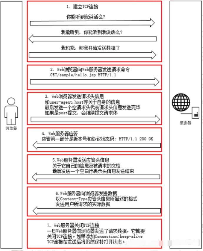 用户和Web服务器之间的基本通信会话通过用户浏览器发送HTTP和接收HTTP响应实现的,下图反映了完整的HTTP请求过程