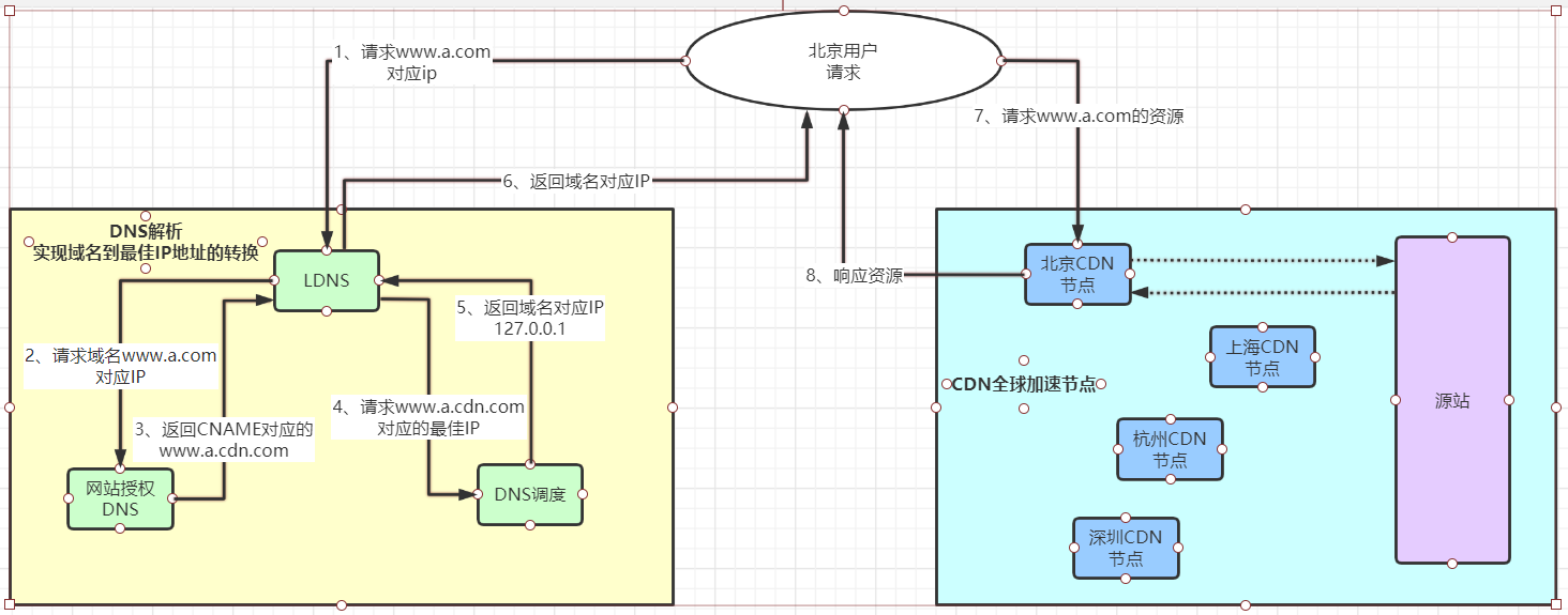 www.a.com下的指定资源发起请求时,首先向LDNS(本地DNS)发起域名解析请求。 - LDNS检查缓存中是否有