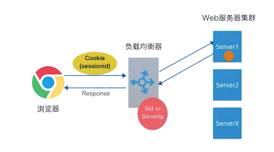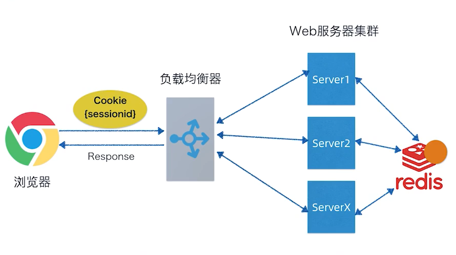 通过缓存Redis,将用户的会话存储在后台的一个Redis缓存中,好处是 LB 和 server集群都不用去存储会话,当需要session ID 时,只需要去Redis中去获取即可,这样server集群的水平扩展性提高了。