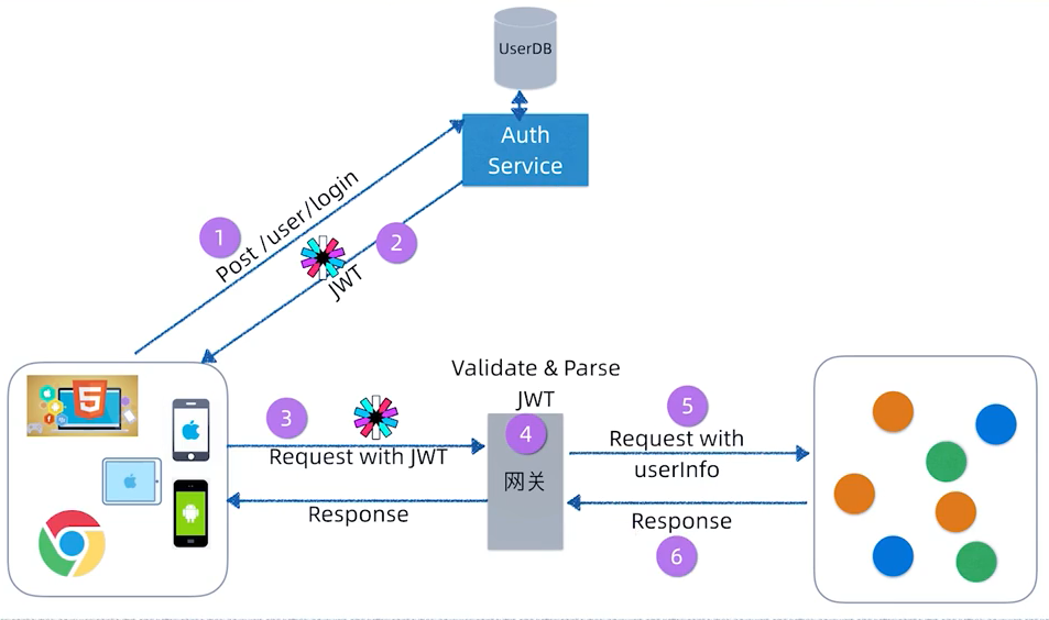 - 优化后,如第4步,网关不需要再去 Auth Service 做认证,因为JWT 自包含数据和签名,网关就只去解析这个JWT 令牌就可以了,不需要再去