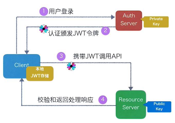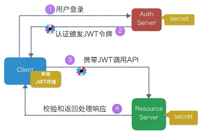 - 4.resource(后台service)在拿到这个token后通过声明好的secret 进行解签,拿到 JWT 信息后处理逻辑后返回数据到client。