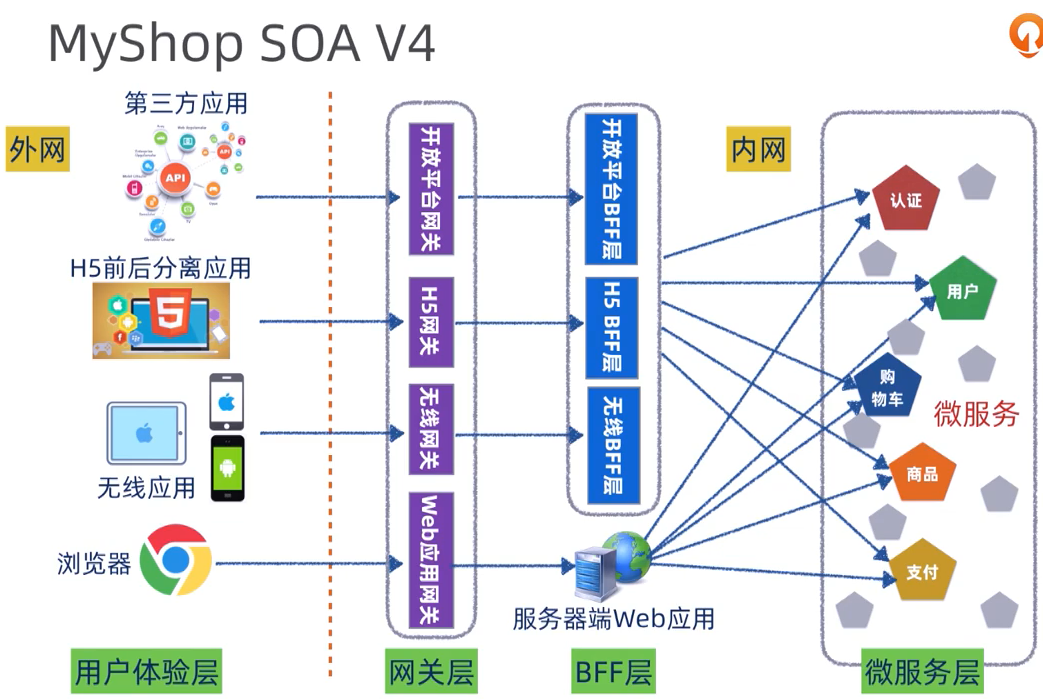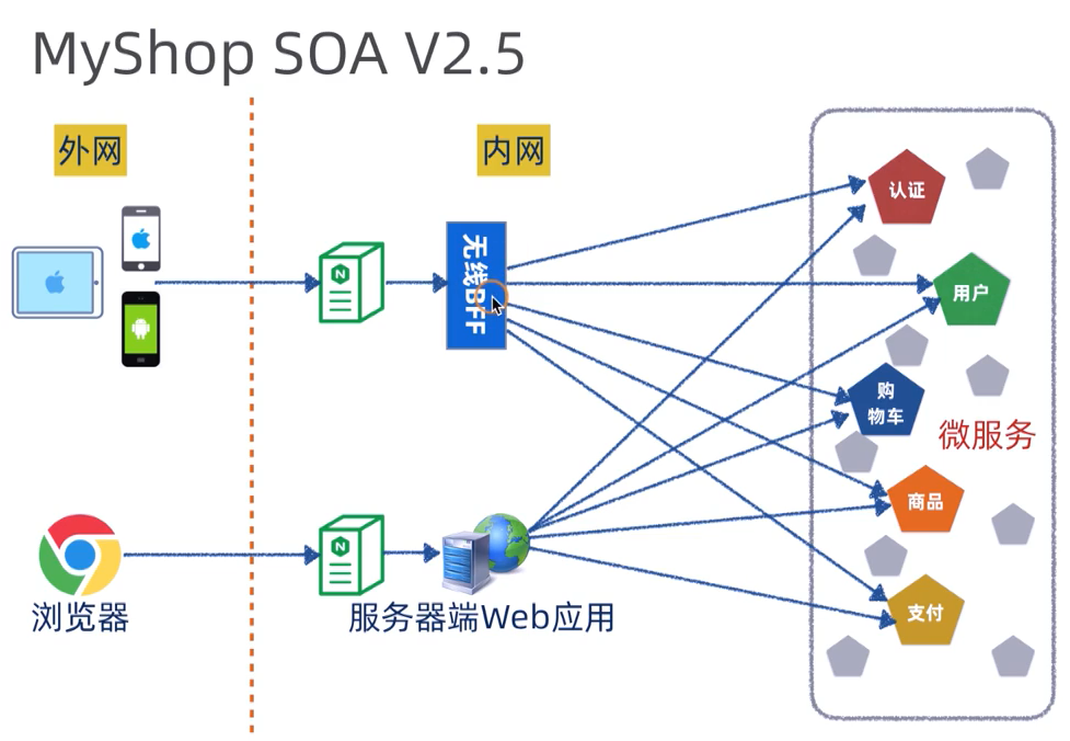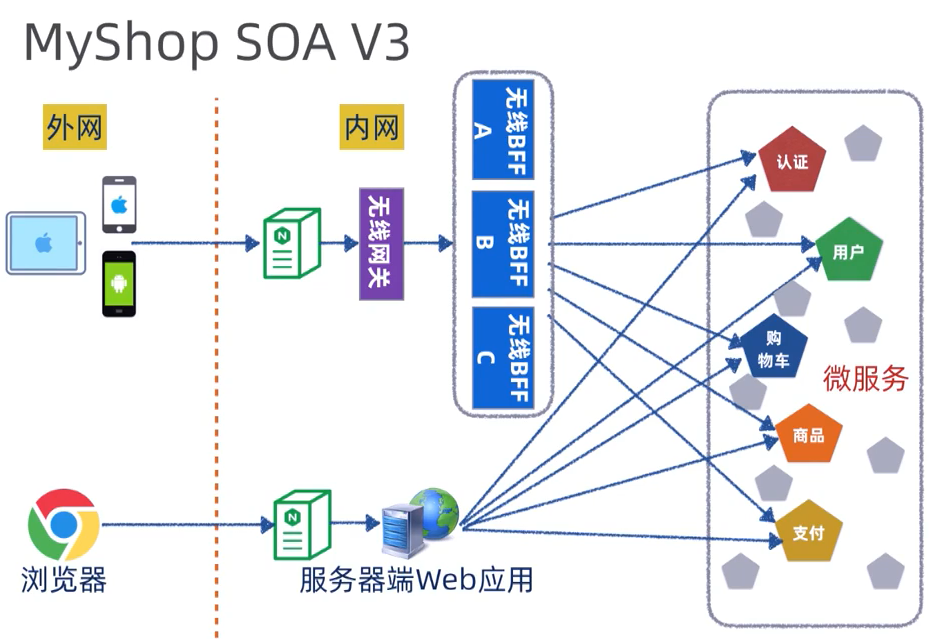 - 2.在内部内部BFF 之前,再引入一层 网关(gateway),网关专门负责跨横切面的功能。