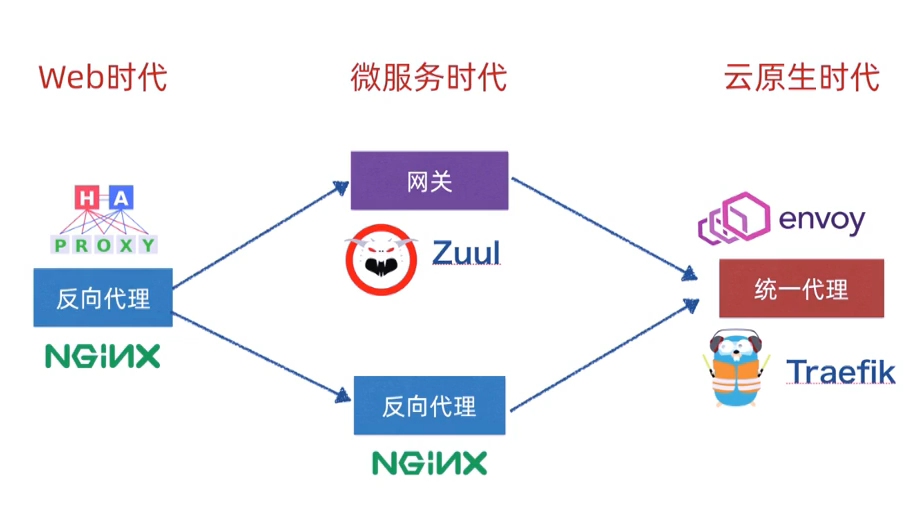 背景: web1.0、2.0 早期时代,主要是以网站形式呈现出来,大多采用 前置反向代理,主要就是 反向代理和负载均衡,典型的有Ngix、HA Proxy,这些产品成熟稳定性能高,一般由运维团队管理。