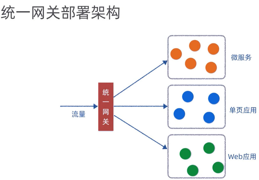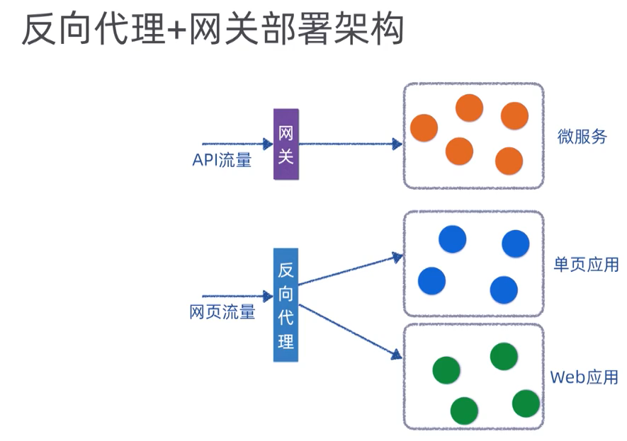说明: 早期、网关和反向代理是分开的,微服务躲在网关后面,单页应用和Web 应用一般躲在反向代理后面,网关一般可以分集群部署,如H5网关、web APP网关等,这种部署架构相对来说比较复杂,反向代理和网关都有,维护成本高,如果反向代理和网关不在同一个域 中,还要解决 跨域 的问题。