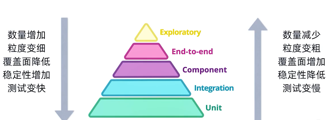 - 端到端测试: 建议力度放少,因为成本比较高,而且不稳定,好处是他的覆盖面比较广,实践上一般绕不开的,一定要去做。