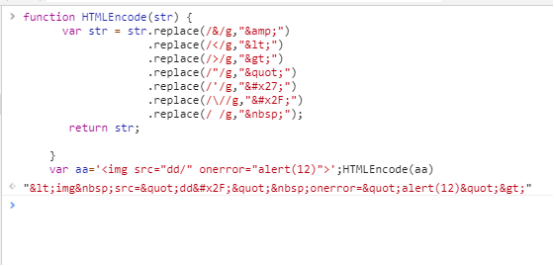 //转义 function HTMLEncode(str) { var str = str.replace(/&/g,"&") .replace(/</g,"<") .replace(/>/g,">") .replace(/"/g,""") .replace(/'/g,"'") .replace(///g,"/") .replace(/ /g," "); return str; } //反转义 function HTMLDecode(str) { var str = str.replace(/&/g,"&") .replace(/</g,"<") .replace(/>/g,">") .replace(/"/g,""") .replace(/'/g,"'") .replace(///g,"/") .replace(/ /g," "); return str; } //注:空格的转义不是安全方面,是为了解决多个空格,页面只会显示一个空格的间距问题。