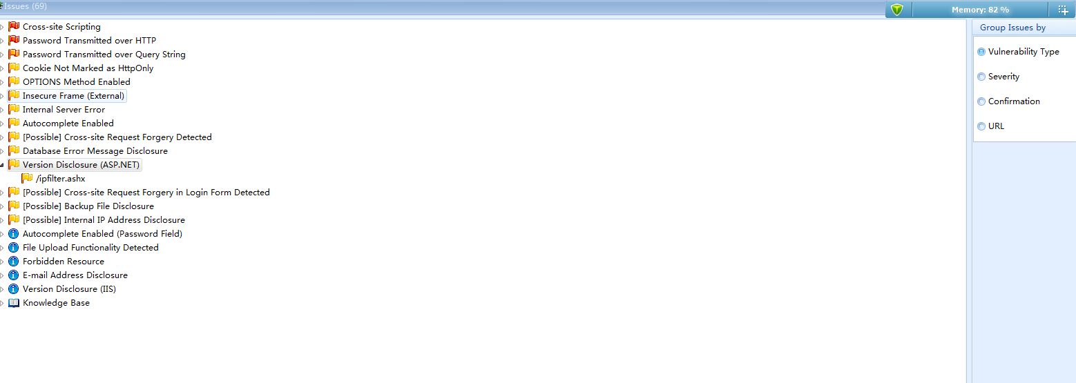 3 下图是是结果,可以按漏洞的类型,地址等进行分类 ,红色旗帜表示严重