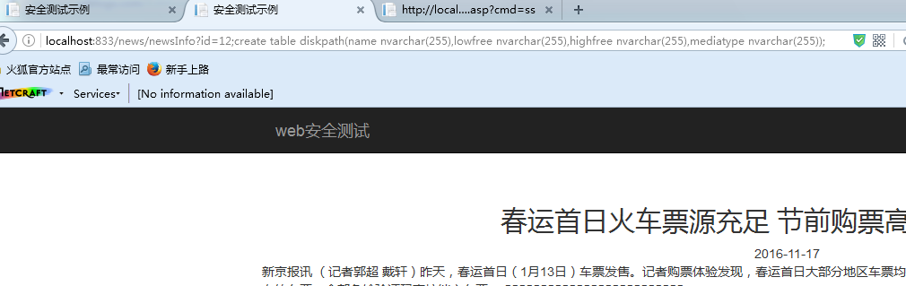 URL地址栏输入 http://localhost:833/news/newsInfo?id=12;create table diskpath(name nvarchar(255),lowfree nvarchar(255),highfree nvarchar(255),mediatype nvarchar(255)); 回车创建一张表保存磁盘信息