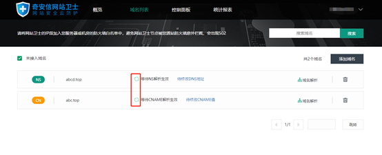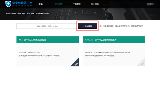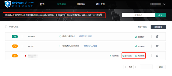 8、 至此就完成了域名的接入,域名接入成功后才可查看“控制面板”和“统计报表”,接入域名后不要忘记将网站卫士的IP段加入您服务器或机房的防火墙白名单中,避免网站卫士节点被您源站防火墙意外拦截,会出现502报错。