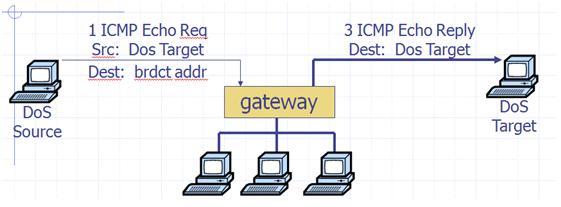 攻击者伪装成受害主机地址,向广播地址(如192.168.1.255)发送echo request。