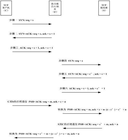 在防火墙收到来自外网的SYN包时,它并不直接进行转发,而是缓存在本地,再按照原来SYN Cookie的机制制作好一个针对这个SYN包的SYN+ACK包,注意,这个SYN+ACK包中的ack顺序号为特制的cookie值c,更重要的是这个包的的源地址被伪造成了S的地址(为了描述方便,我们这里暂时不考虑NAT等其他因素)。这样C会接收到这个SYN+ACK包,并认为是从S反馈回来的。于是C再响应一个ACK包,并认为与S的TCP连接已经建立起来。这时防火墙F收到这个ACK包,按照前面的描述的SYN Cookie原理来检查这个ACK中的ack顺序号。如果认为合法,F将本地缓存的来自C的SYN包发送给S,这时S会响应一个SYN+ACK包到C,其中也携带一个seq号, 我们设为c`。当然这个包不会到达C,而是由防火墙F截取,F根据这个包中的序列号等信息,造一个ACK包响应到S。这时的情况是:C认为自己已经与S建立了TCP连接;S认为自己与C建立了TCP连接。以后的TCP数据内容可以直接穿过防火墙F,在S和C之间交互。