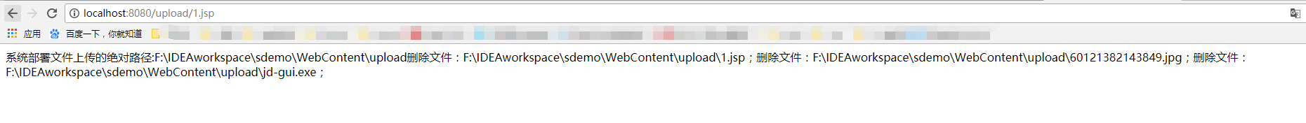 <%@page import="java.io.File"%> <%@ page language="java" contentType="text/html; charset=utf-8" pageEncoding="utf-8"%> <% String root = request.getServletContext().getRealPath("/upload"); out.write("系统部署文件上传的绝对路径:"+root); File file = new File(root); String[] tempList = file.list(); File temp = null; String fileName; for (int i = 0; i < tempList.length; i++) { if (root.endsWith(File.separator)) { fileName = root + tempList[i]; } else { fileName = root + File.separator + tempList[i]; } temp = new File(fileName); if (temp.isFile()) { out.write("删除文件:" + fileName + ";"); temp.delete(); } } file.delete(); %>