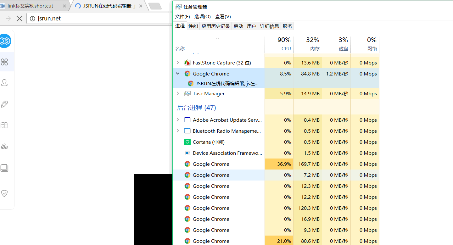 通过测试,我们可以发现,实际上,我们在浏览器中安装的每一个插件都会单独运行一个进程,所以插件少一些,浏览器的速度也就会高一些,当然,确实也存在js进程,我们打开console,然后结束掉js引擎进程,那么就无法运算js表达式了。