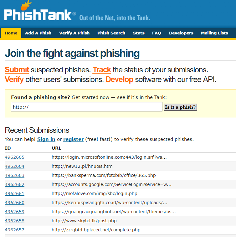 PhishTank 是互联网上免费提供恶意网址黑名单的组织之一, 它的黑名单由世界各地的志愿者提供,而且更新频繁。(注:phish 即 fish ,比喻为钓鱼网站; tank 即箱; 故phishTank即钓鱼网站汇总箱之意)