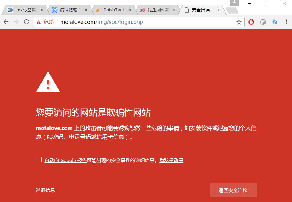 然后在chrome浏览器中输入其中一个高速为恶意的网站 http://mofalove.com/img/sbc/login.php,提示如下: