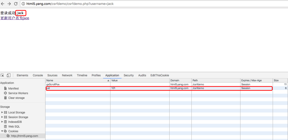 1 <?php 2 // 这里用一个data.json文件保存用户数据,模拟数据库中的数据 3 // 先初始化data.json中的数据为{"id":101,"username":"jack"}, 注意这句只让它执行一次, 然后把它注释掉 4 // file_put_contents('data.json','{"id":101,"username":"jack"}'); 5 6 $data = json_decode(file_get_contents('data.json'), true); 7 8 // 这里为了简便, 省略了用户身份验证的过程 9 if ($data['username']) { 10 // 设置cookie 11 setcookie('uid', $data['id'], 0); 12 echo "登录成功, {$data['username']}<br>"; 13 } 14 ?> 15 16 <a href="http://html5.yang.com/csrfdemo/get-update.php?uid=101&username=json"> 17 更新用户名为json 18 </a>