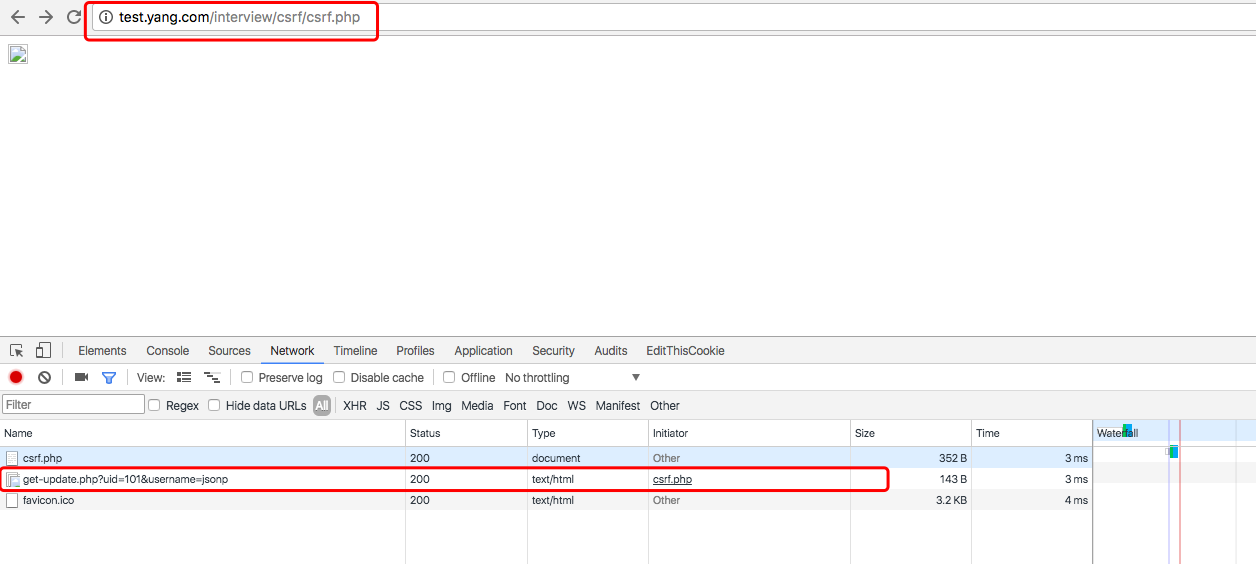可以看到上面的代码没有php代码,只有一个img标签,img标签的src就是A站点的那个更新用户名的链接,只不过把username改为了jsonp,访问站点B的csrf.php这个页面: