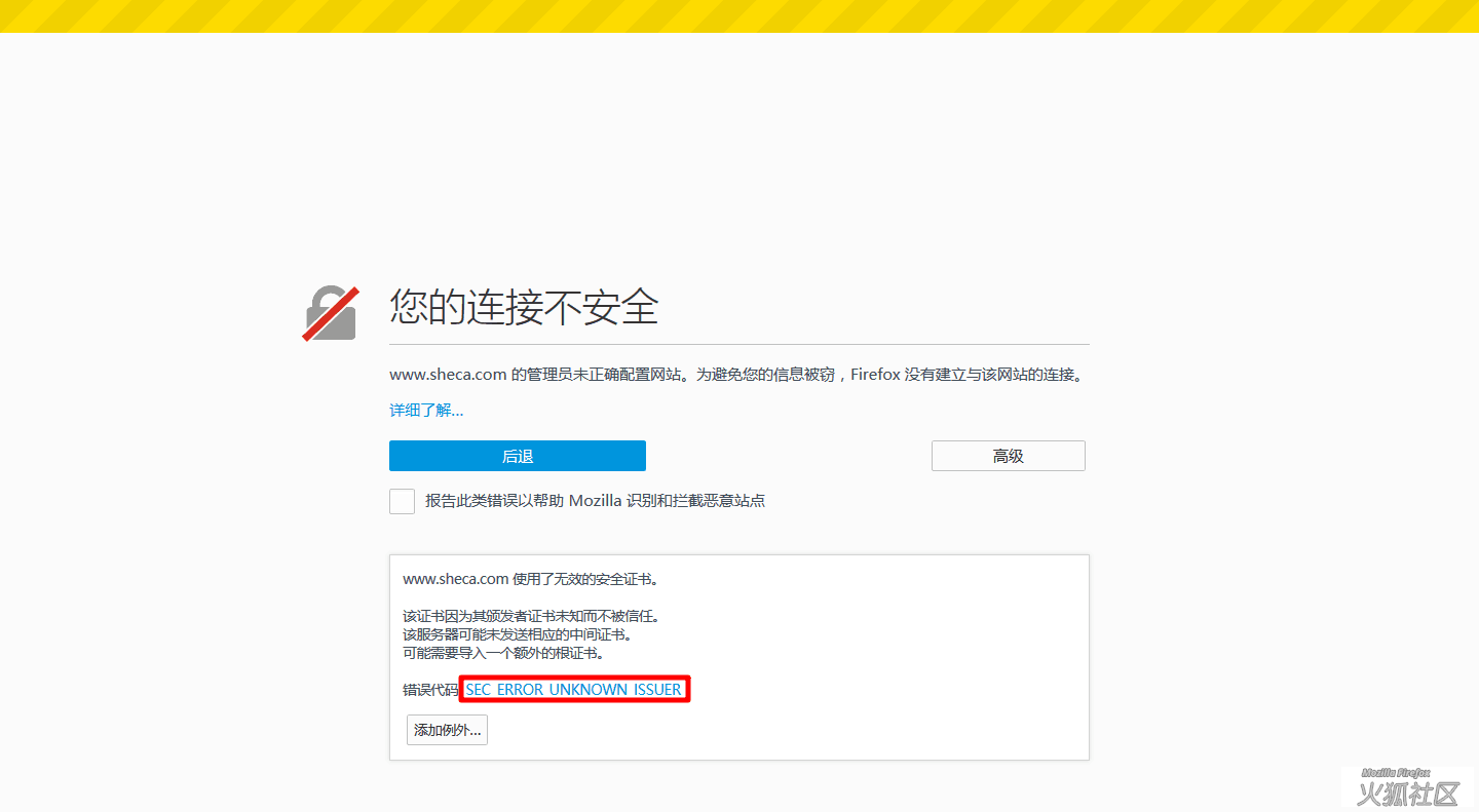点击 高级 按钮可以查看更多信息,了解为何此连接不安全。如果用户访问的是常见网站均出现这个错误:例如百度、淘宝、Mozilla 官方网站等,并显示错误信息为 SEC_ERROR_UNKNOWN_ISSUER 则很有可能是系统被导入了一个未知的根证书。由于火狐拥有自主的证书存储机制,这是同 Windows 系统证书存储互相独立的一套证书存储机制,未知的根证书通常不会导入到火狐的证书文件,就会出现这个错误。