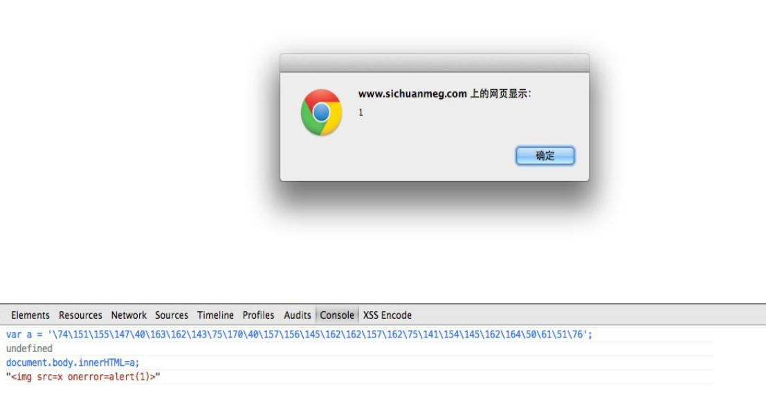 看到了把 经过js的解码 我们的代码又还原回来了 并且注入到了网页中!这时候代码执行!成功弹窗!
