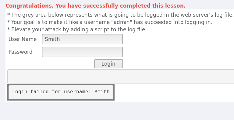 可以通过加入换行符来欺骗人的肉眼,输入user name为Smith%0d%0aLogin Succeeded for username: admin,%0d%0a是/r/n换行符,这样就通过一次登录在日志中伪装成了两次登录。结果如下