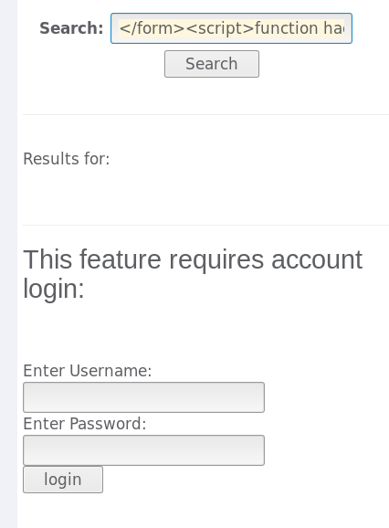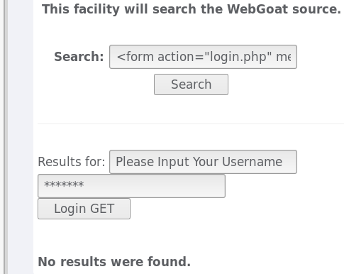 目标是搜索后生成一个含有用户名和密码表单,提交后把输入发送到http://localhost/WebGoat/catcher?PROPERTY=yes &user=catchedUserName&password=catchedPasswordName,可以先输入个简单的表单测试一下,比如把实验8中的表单提交上去结果如下: