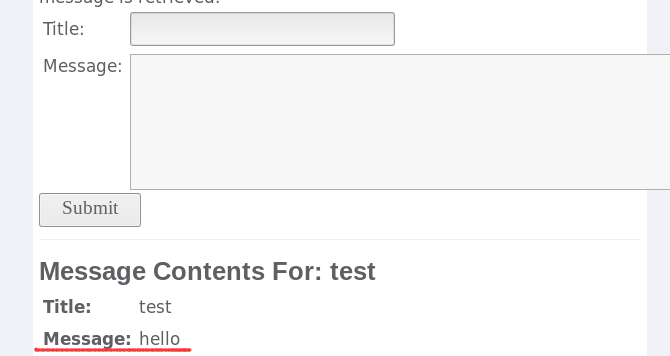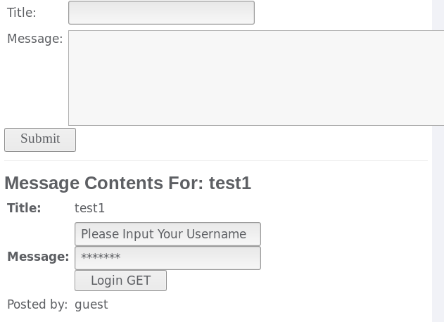 用户可以提交title和message到服务器,且其他用户可以点击title查看message,目标是通过xss在message中植入自己的js脚本或者html页面。