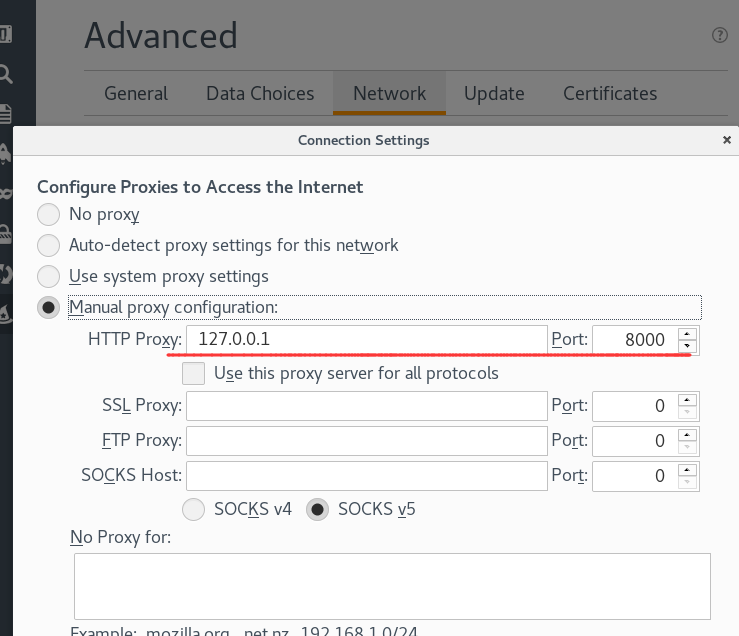 注意把NO Proxy for里的内容删掉,有可能默认有localhost和127.0.0.1不用代理。