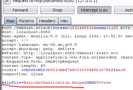 可以看到这里应该是把复选框中的内容拼接到了这个文件夹下并且cat查看,自然地我们想到cat之后继续让他执行我们想执行的命令,但因为这里是复选框,我们只好在burpsuite中来修改。打开burpsuite的intercept,然后再次点击view提交,查看数据包如下。
