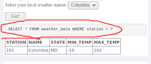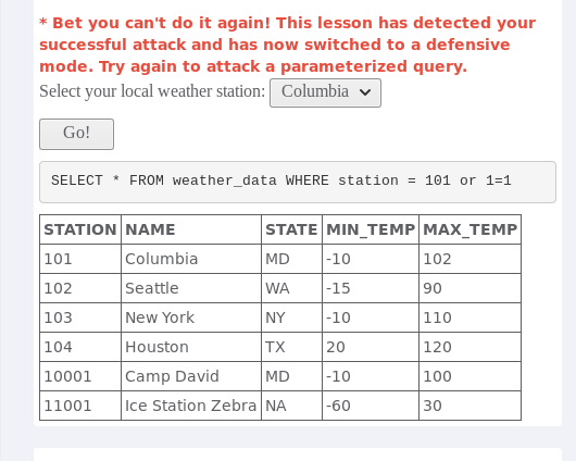 题目已经给出了sql语句,接下来的就非常简单了,利用burpsuite改一下station的值,把它从101改为101 or 1=1,然后forward,得到下面结果,攻击成功。