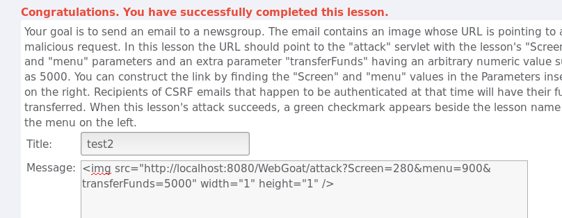 Your goal is to send an email to a newsgroup. The email contains an image whose URL is pointing to a malicious request. In this lesson the URL should point to the “attack” servlet with the lesson’s “Screen” and “menu” parameters and an extra parameter “transferFunds” having an arbitrary numeric value such as 5000. You can construct the link by finding the “Screen” and “menu” values in the Parameters inset on the right. Recipients of CSRF emails that happen to be authenticated at that time will have their funds transferred. When this lesson’s attack succeeds, a green checkmark appears beside the lesson name in the menu on the left.