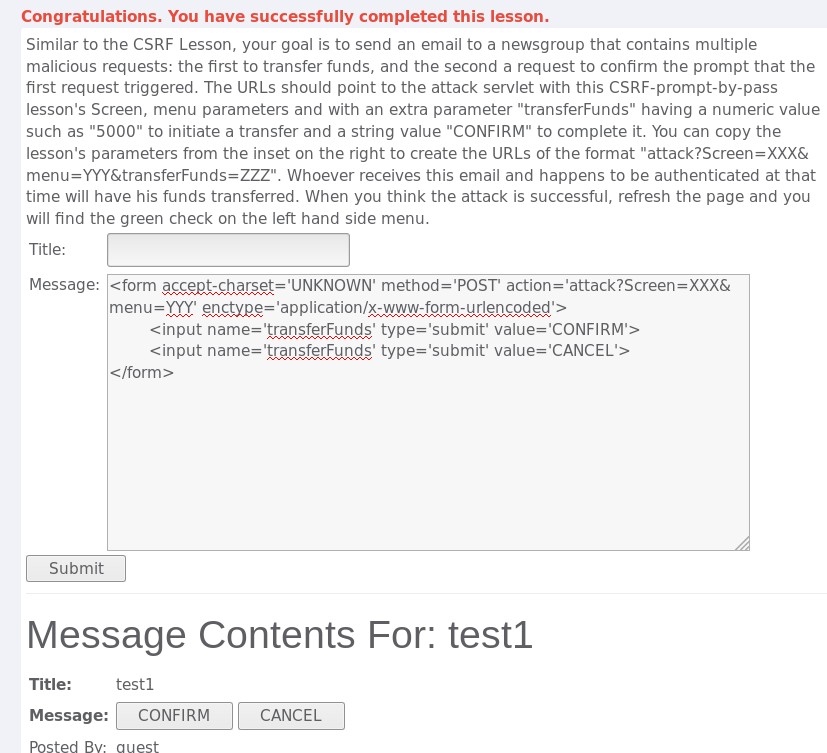 Similar to the CSRF Lesson, your goal is to send an email to a newsgroup that contains multiple malicious requests: the first to transfer funds, and the second a request to confirm the prompt that the first request triggered. The URLs should point to the attack servlet with this CSRF-prompt-by-pass lesson’s Screen, menu parameters and with an extra parameter “transferFunds” having a numeric value such as “5000” to initiate a transfer and a string value “CONFIRM” to complete it. You can copy the lesson’s parameters from the inset on the right to create the URLs of the format “attack?Screen=XXX&menu=YYY&transferFunds=ZZZ”. Whoever receives this email and happens to be authenticated at that time will have his funds transferred. When you think the attack is successful, refresh the page and you will find the green check on the left hand side menu.